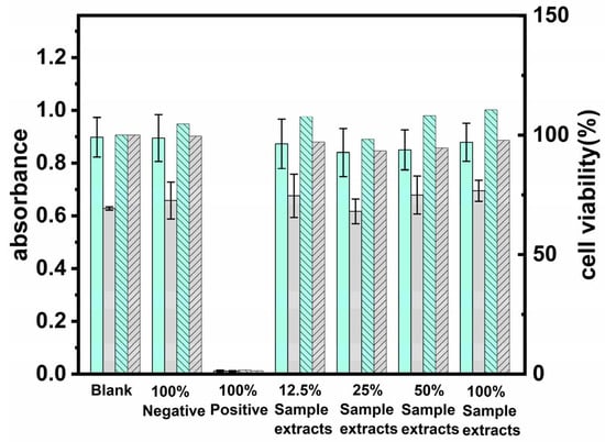 Biocompatibility is a key indicator of the compatibility between contact lens materials and ocular tissues. Cytotoxicity evaluation via mitochondrial metabolic activity assessment revealed that ZnO-based photonic nanostructured ocular interfaces demonstrated statistically significant enhancement in spectrophotometric absorbance metrics (143% relative to reference toxicant benchmarks). Comparative analysis with baseline culture conditions showed that extract-exposed cellular populations maintained ≥93% cytocompatibility indices (Figure 8), confirming the absence of a cytotoxic response and validated biosafety profiles meeting standards [28]. This result is consistent with Lei’s findings [28], suggesting that ZnO nanoparticles are safe for use in contact lenses.