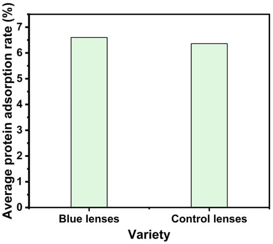 Ocular metabolic homeostasis fundamentally depends on atmospheric oxygen diffusion, establishing gas-phase transport capacity as an essential physiological determinant for biomaterial evaluation. The oxygen permeability coefficient (Dk/t) of ZnO photonic crystal nanoparticle contact lenses was 13.03 × 10−11 (cm2/s) [mLO2/(mL·mmHg)], while that of the control lenses was 17.09 × 10−11 (cm2/s) [mLO2/(mL·mmHg)] (Table S1). The results indicate that the addition of ZnO photonic crystal nanoparticles does not significantly affect the oxygen permeability of the lenses. This result aligns with Lei’s findings [28], suggesting that ZnO photonic crystal nanoparticles have high oxygen permeability in contact lenses.