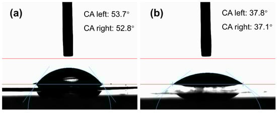 The surface hydrophilicity of contact lenses directly affects wearing comfort. The contact angles of the zinc oxide photonic crystal nanoparticles contact lenses were 37.8 and 37.1, while the contact angles of the control contact lenses were 53.7 and 52.8 (Figure 10), respectively. Zinc oxide photonic crystal nanoparticle contact lenses performed very well in hydrophilicity tests, which indicated that the addition of zinc oxide photonic crystal nanoparticles greatly improved the surface hydrophilicity of the contact lenses and made the wearing experience more comfortable. It was shown that zinc oxide photonic crystal nanoparticles are highly hydrophilic in contact lenses.