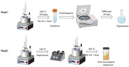Monodispersed ZnO colloid nanoparticles were synthesized by a modified sol-gel method. The preparation process is shown in Scheme 1. First, 57.5 g DEG and 1.1 g (CH3COO)2Zn·2H2O were added into a 100 mL container. The flask containing the mixture was heated in a constant-temperature oil bath with a condensation reflux device at 160 °C and stirred magnetically for 1 h. The flask was then moved to a water bath to cool to 25 °C while stirring continuously. The emulsion obtained was centrifuged at 8000 r/min for 15 min. The collected supernatant is used as the seed crystal for subsequent ZnO growth. Next, 57.5 g DEG and 1.1 g (CH3COO)2Zn·2H2O were added into a 100 mL three-necked flask. The flask containing the mixture was heated in a constant temperature oil bath at 140 °C using a condensation reflux device and stirred magnetically (300 r/min). ZnO seed crystals were added into a mixed solution system of three-necked flasks at a rate of 15 mL/h using an injection pump. As the volume of zinc oxide seed crystals added changes, the color of the photonic crystal film formed by drop-coating on the countertop changes. Following precursor introduction, thermal processing at 160 °C (1 h duration) facilitated nanocrystal growth, with subsequent ambient cooling and high-speed centrifugal isolation (8000 rpm, 30 min) yielding monodisperse ZnO nanoparticles.