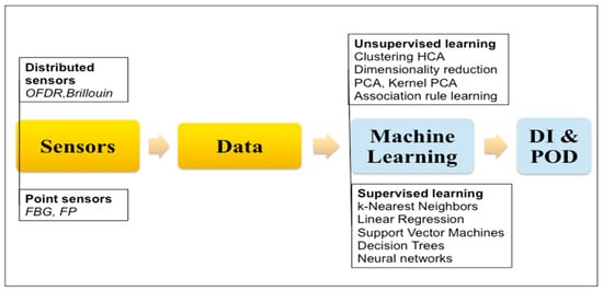 Different algorithms have been proposed, which can be broadly categorized into two groups, as sketched in Figure 1. The first group is based on unsupervised learning techniques to identify differences between two datasets. Because the number of sensors must be large and tests must be repeated to achieve statistical significance, multivariate data analysis methods are used; the most commonly employed is Principal Component Analysis (PCA). PCA is a robust algorithm that does not require any prior assumptions about the type of damage and produces, for each new dataset, a single scalar known as the “Damage Index” (DI), which quantifies the deviation of the new data from the baseline measurements.