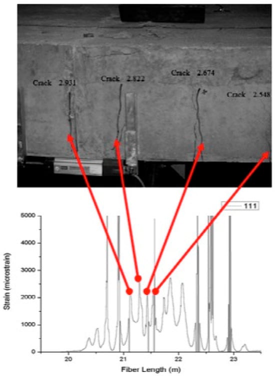 One of the earliest experiments utilizing DFOSs for damage detection was presented at ref [5]. In that study, a 7 × 2 m concrete slab under flexural loads was instrumented with optical fibers bonded to both the upper and lower surfaces. Due to the brittle nature of concrete, cracks appeared on the tensile side under relatively low loads. Concurrently, peaks in the strain distribution—recorded by the optical fiber on that surface—were observed. Although the average strain was rather low (approximately 50 microstrains), the segment of the optical fiber bridging a crack experienced significantly higher local strain due to the crack opening. As the load increased, both the number of cracks and corresponding strain peaks increased; the strain data were then used to accurately identify the number and positions of these cracks (Figure 4). Since then, this approach has been applied to many other civil structures, as reported in [2].