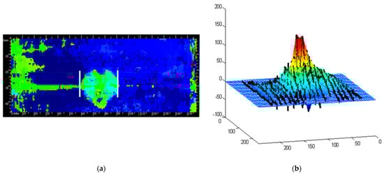 Ultrasonic image of the laminate after impact, showing the delaminated area (a), and the strain map in the delaminated area (b).