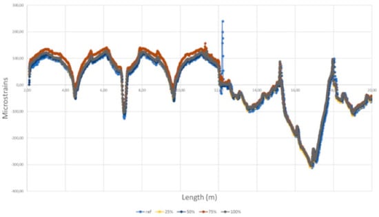 Experimental strain measurements. Different colors indicate different levels of damage (partial debonding between the two fuselage skins). On the top side, subjected to tensile strains, the optical fiber completes four loops, evidenced by the symmetry of the strains. The changes in the strains are noticeable only for the full debonding.