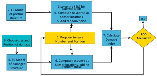 The previously described algorithm requires that the physical structure is already built, that sensors are installed, and that a large number of load tests are conducted—procedures that can be costly and time-consuming. Simulation can significantly reduce these costs by enabling virtual experiments in which load conditions, sensor number and placement, and damage size are varied. These virtual tests can be used to compute Model-Assisted Probability of Detection (MAPOD), a process that is now common in non-destructive testing (NDT) procedures.