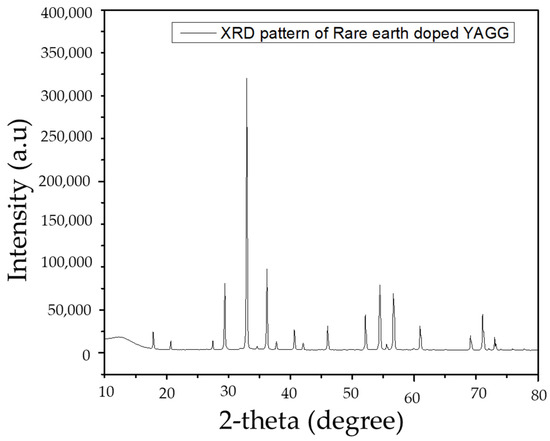 Figure 3 presents the XRD results for the near-infrared (NIR) down-conversion phosphor. The diffraction angle (2-theta) was investigated in a range from 10° to 80°. Diffraction peaks were observed at 2-theta values of 17.8°, 20.7°, 27.5°, 29.4°, 33.0°, 34.7°, 36.2°, 37.7°, 40.6°, 42.1°, 46.0°, 52.2°, 54.5°, 55.5°, 56.7°, 60.9°, 69.1°, 71.1°, and 73.1°. These match well with the standard card (ICPDS: No. 089-6660) for Y3Al2Ga3O12 (YAGG); thus, the host material was confirmed as YAGG [23]. In addition, the intense diffraction peaks and narrow peak bandwidth with a FWHM of 0.1° revealed a high crystallinity of the YAGG host material. The highest intensity of the peak at a diffraction angle of 33° indicated that the strongest growth of the crystal was along this orientation.