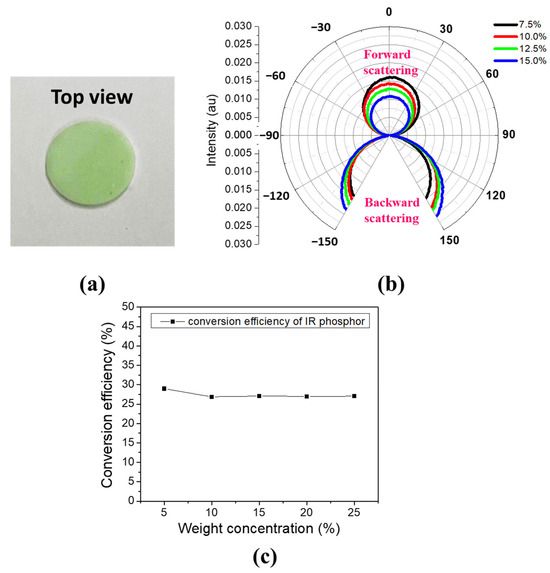 As backward scattering can cause significant loss in the packing process, it is important to understand the scattering behavior caused by the NIR phosphor at different weight concentrations. The NIR phosphor was mixed with silicone gel to make plates as shown in Figure 5a. The thickness and diameter of each plate were 0.6 mm and 16 mm, respectively. In this study of the scattering behavior of the NIR phosphor, the selection of the laser wavelength considered its absorption and re-emission by the NIR phosphor, which could affect the accuracy of the scattering behavior results. Considering the absorption of the NIR phosphor, an IR laser diode with a wavelength of 808 nm was chosen to study the effect of the phosphor weight concentration on the scattering behavior of incident radiation. The radiation at wavelength 808 nm, incident normal to the plate, scattered in different directions. The optical power was scanned around the plate to detect this scattered radiation. Figure 5b shows the forward and backward scattering of 808 nm wavelength NIR radiation hitting the NIR phosphor plate. The result shows that for the weight concentration range of 7.5% to 12.5%, the scattering intensity was inversely proportional to the weight concentration of the NIR phosphor.