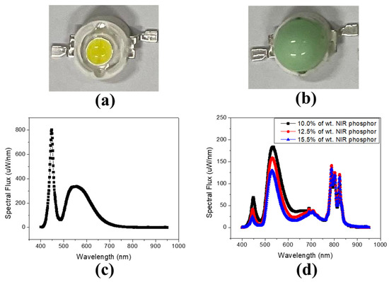 After obtaining this information on the NIR phosphor, we prepared some samples that can emit a broad spectrum to study the emission spectrum of the emitter. In detail, pcW-LEDs were covered with NIR phosphor at different weight concentrations of 10.0%, 12.5%, and 15.5%. Figure 7a,b show the sample pcW-LEDs without and with the NIR phosphor covering. Figure 7c,d show the emission spectra of the pcW-LED without the NIR phosphor and the pcW-LEDs encapsulated with NIR phosphor at weight concentrations of 10.0%, 12.5%, and 15.5%. Broadband emission from 400 nm to 900 nm was obtained, as shown in Figure 7d. At the higher weight concentrations of the NIR phosphor, the emission spectrum showed a lower output intensity of the blue and yellow bands, but the emission in the NIR region was not different. This suggests the use of a low concentration of NIR phosphor (i.e., 10% of wt.) to maximize the output of blue and yellow light.