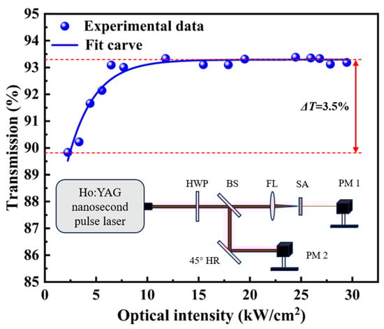 We successfully fabricated Mo2TiAlC2-based SAs and provided a detailed description of the preparation process in our prior study [35]. Additionally, extensive characterization and testing were carried out to comprehensively analyze their morphology and molecular structure features. Within the scope of this scholarly investigation, the nonlinear characteristics of optical absorption were examined for a Mo2TiAlC2-based SA. These investigations were conducted using an I-scan apparatus, which features a simpler structure, lower cost, and greater ease of operation compared to conventional methods. As illustrated in Figure 1, the spot radius converging at the Mo2TiAlC2-based SA was 194 μm. The initial transmittance of the Mo2TiAlC2-based SA, as determined by curve fitting, is 89.8%, whereas the transmittance at absorption saturation is 93.3%. This results in a modulation depth of 3.5%. The use of a self-constructed, actively Q-switched Ho:YAG laser, serving as the pump source for I-scan measurements, is evident. This apparatus operates at a PRF of 1 kHz with a pulse duration of 10 ns. Under this configuration, the central wavelength output achieves approximately 2091 nm. The experimental setup consisted of a half-wave plate (HWP), a beam splitter (BS), a focus lens (FL), and a 45° high reflectivity mirror (45° HR). The data were curve-fitted using the following mathematical relationship [36]: