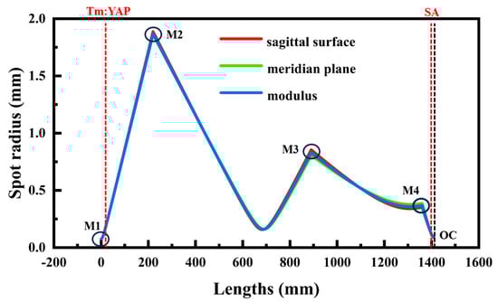 Prior to the physical construction of the resonant cavity, we designed an M-type 5-mirror folded cavity based on the ABCD matrix theory. The relevant parameters were determined as follows: M2-M1 = 220 mm, M3-M2 = 670 mm, M4-M3 = 470 mm, and OC-M4 = 50 mm. Additionally, by adjusting the angle of incidence, we enhanced the overlapping area between the meridian and sagittal surfaces, ultimately setting the angle of incidence θ to 8°. Under conditions where the pump wavelength is set at 792 nm and the crystal length is 7 mm, with the thermal lens effect neglected, results obtained from the use of self-programmed simulation software for optical path modeling are presented. It can be observed from this situation that Figure 2 presents these findings adeptly. In this figure, the three curves representing the sagittal surface, the meridian plane, and the modulus are nearly overlapped, indicating that the resonant cavity can form a stable laser output. The spot radii at M1 and OC are 130 µm and 89 µm, respectively. The SA is located adjacent to the OC, with a spot radius measured at 114 µm at the position of the SA. This value is sufficiently small to meet the power density requirement for achieving saturation in the SA. It can therefore be concluded that the designed M-type passively mode-locked cavity demonstrates a certain degree of feasibility.