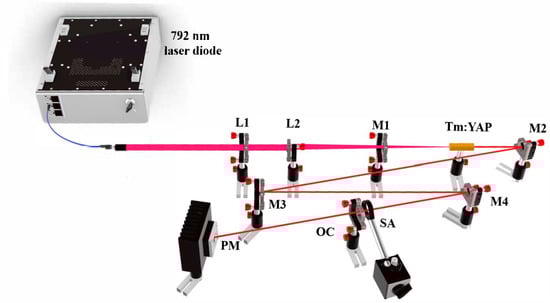 As depicted in Figure 3, optical excitation was achieved using a laser diode characterized by a core diameter of 105 μm, an emission wavelength of 792 nm, and a numerical aperture of 0.22. The operational capabilities of the PML configuration were enabled by a gain medium consisting of a Tm:YAP crystal measuring 3 × 3 × 7 mm3 along the b-axis, doped with Tm3⁺ ions at a concentration of 3 at.%. To maintain experimental stability and thermal management, the Tm:YAP crystal was carefully encapsulated in indium foil to enhance thermal conductivity and minimize thermal fluctuations. Subsequently, the crystal was mounted within a water-cooled heat sink, maintaining a stable temperature of 15 °C throughout the entire experiment. This precise thermal control scheme was implemented with the aim of suppressing potential thermal drift phenomena and ensuring the accuracy of spectral measurements. To enhance optical performance, high-transmittance films were coated on both surfaces of the crystal, which are respectively applicable to the spectral ranges of 790–810 nm and 1900–2100 nm. M1 and OC were both flat mirrors. M1 served as the input coupler, featuring high transmittance (T > 90%) in the 790–810 nm range on its two surfaces and high reflectivity (R > 99%) at 1900–2100 nm on its internal surface. The OC was designed with a coating exhibiting high reflectivity in the 790–810 nm wavelength range and controlled partial transmittance (T = 2% or 5%) within the 1900–2100 nm waveband. The mirrors labeled M2, M3, and M4 are plano-concave, with radii of curvature measuring 300 mm for both M2 and M3 and 100 mm for M4. The spatial distances between the optical components are as follows: from M1 to M2 is 220 mm, from M2 to M3 is 670 mm, from M3 to M4 is 470 mm, and finally, from M4 to the OC is 50 mm. The power meter (PM, PM100D, Thorlabs, Newton, NJ, USA) was placed behind the OC to assess the output power. The SA was determined to be in close proximity to the OC to achieve two critical objectives: first, it facilitates the attainment of the PML threshold condition; second, it ensures that the SA operates at the optimal energy density for effective mode-locking performance [38]. This arrangement strikes a balance between enhancing nonlinear optical effects and preserving cavity stability.