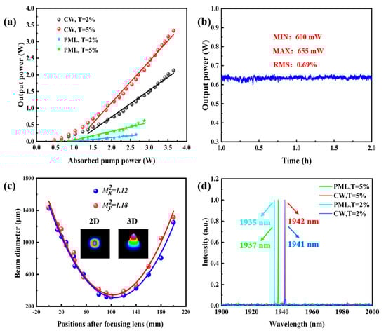 (a) Correlation between resulting output power and absorbed pump power for CW and PML modes at T = 2% and T = 5%; (b) stability of output power in PML mode at T = 5%; (c) beam quality of PML mode at T = 5%; (d) output spectrum for CW and PML modes at T = 2% and T = 5%.