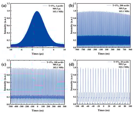 Under the optimized operating parameters (an average power emission of approximately 620 mW and an OC transmission of T = 5%), a systematic investigation was carried out on the time-domain dynamics of the PML Tm:YAP laser. An InGaAs photodetector (ET-5000 model, EOT, Ann Arbor, MI, USA) was used in conjunction with an 8 GHz digital oscilloscope (MSO64B, Tektronix, Beaverton, OR, USA) in this research. It is evident that by modulating the absorbed pump power, PML pulses with a PRF of approximately 106.3 MHz were generated. Interestingly, a decrease in pulse width was observed as the incident pump power increased. The theoretical evaluation of this PRF originates from the equation f = c/2L [44], where f represents the center frequency of the laser resonator, c denotes the constant speed of light, and L corresponds to the physical length of the system. The nonlinear effect of an SA was used to compress pulses, thereby achieving PML. When pulses propagate through the SA, the nonlinear absorption effect suppresses lower-energy pulses, while high-energy pulses pass through with minimal loss. After multiple round trips within the cavity, the pulses become progressively compressed, and their phases become locked. Repeated cycles in the cavity result in the leading and trailing edges gradually attenuating, ultimately achieving a stable laser output [45,46]. The narrowest pulse width, measuring 989.5 ps, was experimentally achieved at an absorbed pump power of 2.88 W. The pulse trains acquired under distinct temporal resolutions (4 μs/div, 200 ns/div, 100 ns/div, and 20 ns/div) are comprehensively presented in Figure 5a–d. Figure 5a depicts the standard PML pulse envelope on a large period, and Figure 5b–d depict the pulse trains on different periods. Time-domain analysis revealed the generation of ultrashort pulses with the shortest pulse width of 989.5 ps, corresponding to a fundamental PRF of 103.1 MHz. The experimental value exhibited excellent agreement with the theoretically predicted PRF of 106.3 MHz, with the observed deviation falling well within the acceptable range of experimental errors. These findings confirm the reliability of the theoretical framework and experimental methodology, demonstrating that the Tm:YAP laser modulated by Mo2TiAlC2-based SA can operate effectively in the PML mode.