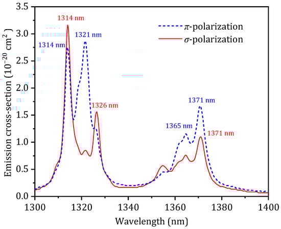 Continuous-wave (CW) lasers emitting in the 1.3–1.4 μm spectral range have gained significant attention due to their diverse applications, including medical laser technologies, environmental monitoring, fiber-optic telecommunications, and visible light generation through nonlinear optical processes [1,2,3,4,5]. Recent advancements in solid-state laser systems have demonstrated successful implementation of single-wavelength (SW) operation within this spectral band using various Nd-doped laser crystals. Notable achievements include development in Nd:YAG [6,7], Nd:Vanadates [7,8,9,10,11,12,13,14,15], Nd:YLF [16], and Nd:YAP [17], highlighting progress in this technologically important wavelength region. Dual-wavelength (DW) lasers with the orthogonal polarization demonstrate significant potential across multiple technological domains, particularly in advanced optical applications such as atmospheric sensing [18], biomedical device development [19], holographic imaging [20,21] and ultra-precise spectral analysis [22]. Their unique wavelength combination capability enables critical functions in self-referencing metrological systems [23], visible/UV light generation via sum-frequency generation and THz wave production via difference-frequency generation [24,25,26,27,28]. In parallel, DW lasers with the same polarization enhance precision metrology and lidar systems by minimizing phase noise and improving interference stability, crucial for atmospheric sensing and high-resolution distance measurements [29]. Additionally, identical polarization alignment in fiber-optic communication (such as wavelength division multiplexing) suppresses inter-channel crosstalk, enabling higher data transmission capacity [30]. Of particular scientific interest are DWs within the 1.3–1.4 μm spectral band [31,32,33,34,35], which show exceptional applicability in quantum precision instruments like silver atom optical clocks, atomic cooling systems operating beyond Doppler limitations, and advanced phototherapeutic implementations [36,37,38]. As a prominent active medium for solid-state laser systems, Nd:YLF crystals exhibit distinctive advantages including intrinsic birefringent properties, minimized thermal lensing effects, and extended radiative decay characteristics [39,40,41,42,43]. Figure 1 illustrates the wavelength-dependent emission cross-sections across the 1.3–1.4 μm spectral range, derived through calculation using the Füchtbauer–Ladenburg formalism [44]. In this study, we achieved the first tunable SW and DW lasers in Nd:YLF crystal in the 1.3–1.4 μm spectral region. Seven CW SWs are realized with the tuning prism. Further, the five-pair of CW DWs are obtained with an intracavity birefringence filter (BF). In addition, the balanced DW power output was also generated with the dual intracavity BFs.