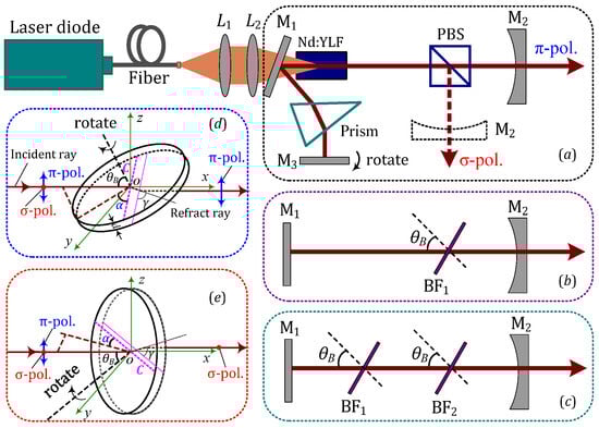 The schematic diagram of the tunable Nd:YLF laser operating on the 4F3/2→4I13/2 transition is displayed in Figure 2a. The pumping source was an LD, providing a central emission wavelength at 806 nm and a 20 W maximum power. The pump light was output by an optical fiber coupling with a 400 μm core diameter and a 0.22 numerical aperture. The spot radius of the pump light was 200 μm. Both identical convex lenses (L1 and L2) with a focal length of the 150 mm and anti-reflection (AR) film for the pump wavelength was used to collimate and focus the pump light into the active medium. A Nd:YLF cut along the a-axis (1.0 at.% doping, 5 mm length) functioned as the active medium with AR at 806 nm and 1310–1380 nm, which was sealed in indium foil and affixed to red copper mounts equipped with water cooling, maintained at 15 °C. The cavity input coupler was a planar mirror (M1) with high reflectivity (HR) for 1310–1380 nm and AR for 806 nm, 1040–1060 nm. The cavity output coupler was a concave mirror (M2) of −300 mm radius of curvature with a transmittance (Toc) of 3.5% at 1310–1380 nm. Two other couplers (Toc = 2.0% and Toc = 5.0%) were also carried out, with the M2 demonstrating the optimal output performance. To obtain SW tuning, a prism with AR for 1310–1380 nm and a plane reflector (M3) with HR for 1310–1380 nm were utilized. By adjusting the M3, SW tuning can be achieved. A polarization beam splitter (PBS) was used to separate two laser beams with orthogonal polarization. To realize DW tuning, a 1.0 mm-thick quartz BF1 was employed as a tuning element, as displayed in Figure 2b. To obtain the balanced DW power output, both BF1 and BF2 (0.5 mm thick) were utilized, as displayed in Figure 2c. To realize the π-polarized DW laser, the placement direction of BF1 is displayed in Figure 2d. The BF1 placed in this way can effectively suppress the σ-polarization because when the direction of the σ-polarized beam was perpendicular to the incident plane (S-wave), the reflection loss of the S-wave was the greatest when it was incident at the Brewster angle. Similarly, the placement direction of BF2 can suppress the π-polarized beam and achieve σ-polarized DW laser output.