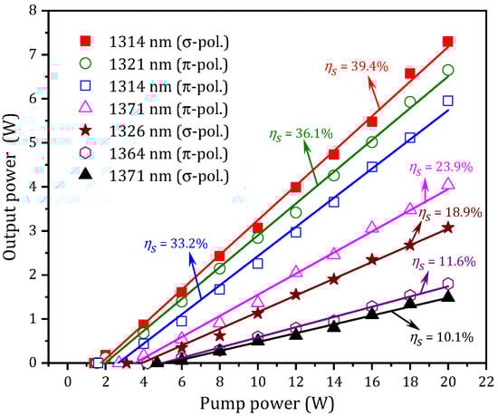 By controlling the tuning angle α, the three-pair of the π-polarized DW lasers at 1321/1314, 1371/1364, and 1364/1321 nm were attained, respectively. The DW laser was separated into the same polarized beams with a flexible wavelength selector Mono F-14 (Spectrolight Inc., Irvine, CA, USA), and the output power for individual wavelengths were measured respectively. The DW laser output–input powers are displayed in Figure 7. At 20 W pump power, the total CW output power of 7.01 (3.71/3.30 W at 1321/1314 nm), 3.12 (1.71/1.41 W at 1371/1364 nm), and 0.78 W (0.45/0.33 W at 1321/1364 nm) were attained, respectively. Their total corresponding optical conversion efficiencies reached 35.1, 16.5, and 3.9%, respectively. The π-polarized DW spectra at the maximum pumping are displayed in Figure 8. The central wavelengths were 1321.3/1314.1 nm, 1370.6/1364.4 nm, and 1321.2/1364.1 nm, with the spectral line widths of 0.23/0.17 nm, 0.14/0.17 nm, and 0.20/0.21 nm, respectively. The M2 factors of the three-pair of DWs were all <1.26. The power stabilities of the three-pair of DWs were all <4.0%.