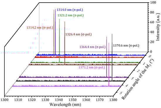 The wavelength tuning was achieved by rotating the reflector M3, enabling discrete π-polarized lasing at 1321, 1314, 1371, and 1364 nm wavelengths, as detailed in Figure 3. Under 20 W pumping, the laser demonstrated output powers reaching 6.71 (1321 nm), 6.02 (1314 nm), 4.11 (1371 nm), and 1.80 (1364 nm) with corresponding lasing thresholds of 1.52, 1.61, 2.70, and 4.22 W, respectively. Their corresponding slope/optical efficiencies were 36.1/33.5% (1321 nm), 33.2/30.0% (1314 nm), 23.9/20.5% (1371 nm), and 11.6/9.0% (1364 nm), respectively. In a four-level laser system, the emission cross-section of the laser transition wavelength is a key influencing factor of the output power. The size of the emission cross-section of the transition wavelength in Figure 1 is consistent with the trend of the output power obtained experimentally. Using the LABRAM-UV spectrum analyzer (HORIBA France SAS, Paris, France) with a resolution of 0.01 nm to scan the laser wavelengths and deal with the data with software, the laser spectra of the π-polarized SW emissions at the maximum pumping, as displayed in Figure 4. The central wavelengths were 1321.2, 1314.0, 1370.6, and 1364.4 nm with the corresponding linewidths (FWHM) of 0.20, 0.16, 0.18, and 0.22 nm. Their corresponding beam quality factors (M2) were 1.11, 1.08, 1.20, and 1.14, respectively. The power stabilities of the SW lasers were measured with a precision power meter, demonstrating all <2.3% over a 1 h.