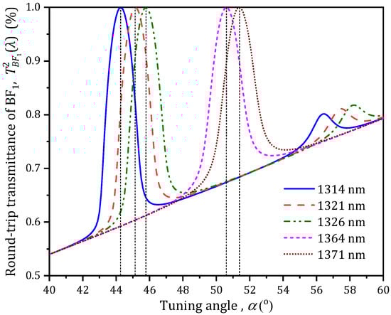 Using Equation (1) with the parameters: θB = 57.15o, ne = 1.5534, no = 1.5443, and d = 1 mm, the cavity round-trip (dual-pass) transmittance (T2BF1,i) versus tuning angle (α) of the BF1 are displayed in Figure 5. It could be observed in Figure 5 that T2BF,i can be controlled by adjusting the BF1. Thus, the lasing output can be tuned between the emission wavelengths. For a four-level laser system operating with CW, the oscillation threshold of each emission wavelength in a DW operation is given by [46]