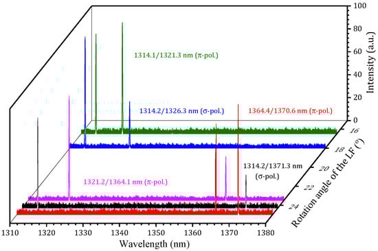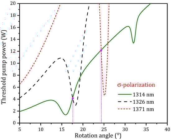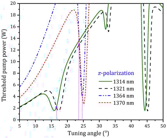 Similarly, the σ-polarized threshold power of the DW laser versus the tuning angle is displayed in Figure 9. The two-pair of σ-polarized DWs of 1326/1314 and 1371/1314 nm were realized. The power characteristics are displayed in Figure 7. The maximum total outputs of 6.10 (3.31/2.79 W at 1326/1314 nm) and 1.18 W (0.65/0.53 W at 1371/1314 nm) were attained, respectively. Their total corresponding optical efficiencies were 30.5, 16.5, and 5.9%, respectively. The σ-polarized DW spectra are also displayed in Figure 8. The central wavelengths were 1326.3/1314.2 nm and 1371.3/1314.2 nm, with spectral line widths of 0.15/0.17 nm and 0.17/0.20 nm, respectively. The M2 factors of the two-pair of DWs were all <1.36. The power stabilities of the two-pair of DWs were all <4.5%.