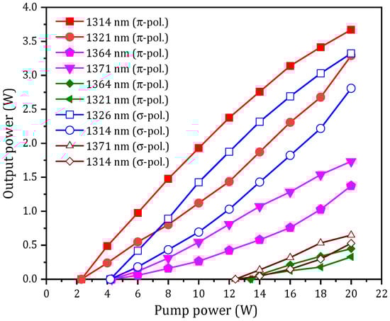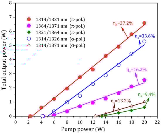 A balanced DW power at 1326/1314 nm in the σ-polarized direction was achieved with a total power output of 5.21 W at the maximum pumping by adjusting the BF2. The output–input characteristic of the DW is displayed in Figure 11. The corresponding total slope/optical efficiency was 33.6/26.1%. The M2 factor of the DW laser was <1.15. The power stability of the DW was <2.2% in 1 h. When the tuning angle of the BF1 was at α = 24° and the BF2 was adjusted, a balanced DW at 1314/1370 nm in the σ-direction was also achieved with a total power of 1.01 W, as also displayed in Figure 11. The corresponding total slope/optical efficiency was 13.2/5.1%. The M2 factor of the DW laser was <1.20. The power stability of the DW was <3.6% in 1 h. The direction of the BF1 and BF2 was adjusted so that the direction of the incident plane of the light was rotated by 90 degrees, as displayed in Figure 2e. The three-pair of the balanced DW at 1314/1321, 1364/1371, and 1321/1364 nm were also generated, respectively. The output–input characteristics of the DWs are also displayed in Figure 11. The total power was 6.42 (1321/1314 nm), 2.61 (1371/1364 nm), and 0.62 W (1364/1321 nm), respectively. The M2 factors of the DW lasers were <1.32. The power stabilities of the DW lasers were all <4.0% in 1 h.
