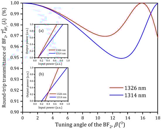 Take the σ-polarized DW at 1326/1314 nm as an instance to demonstrate the achievement of a balanced output of the DW power. It can be obtained in Equation (2) that the equal threshold power for 1326 nm and 1314 nm DW operation requires L1326 < L1314. From Equation (3), it can be seen that ηs,1326 > ηs,1314 when L1326 < L1314 and L0,1326 ≈ L0,1314. A simple schematic is displayed in Figure 10a. This suggests that the two power outputs of the DW cannot be balanced. Hence, if the two output powers of the DW are to be balanced, a new intracavity loss must be introduced to break the DW equal threshold. A BF2 was put in the resonator, the dual-pass transmittance (T2BF2,i) of 1326 nm and 1314 nm was calculated as a function of tuning angle (β), as displayed in Figure 10. When the tuning angle of the BF1 was at α = 18o and the BF2 was adjusted between 0–12o, ηs,1326 > ηs,1314 was still maintained to be calculated by Equation (6), but Pth,1326 < Pth,1314, as displayed in Figure 10b. This suggests that their slope efficiencies always had an intersection point, that was, equal power values could be found.