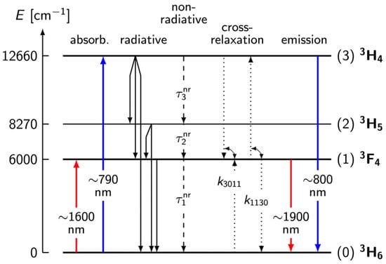 - Tao, M.; Huang, Q.; Yu, T.; Yang, P.; Chen, W.; Ye, X. Cross Relaxation in Tm-doped Fiber Lasers. In Proceedings of the 2nd International Symposium on Laser Interaction with Matter (LIMIS), Xi’an, China, 9–12 September 2012. [Google Scholar] [CrossRef]