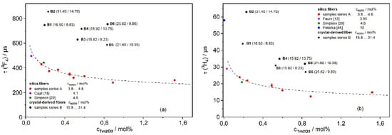 (a) Fluorescence lifetime τ of silica fibers (series A) depending on Tm concentration for the 3F4 level under core-pumping at 789 nm. (b) Fluorescence lifetime τ of crystal-derived fibers (series B, cAl2O3/cY2O3) depending on Tm concentration for the 3H4 level under core-pumping at 789 nm [6].