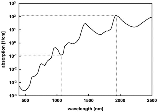 The absorption coefficients of water, and positions of the thulium fiber laser (1940 nm) and the Nd: YAG laser (1064 nm) [22].