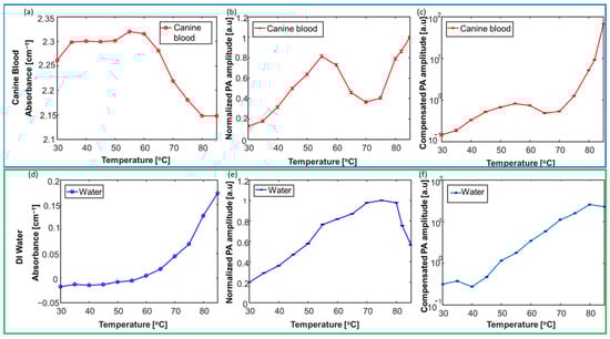 Characterization of the temperature-dependent absorption properties of tissue chromophores, including blood and water. Calibration results for canine blood are highlighted in the top dark blue panels (a–c). Calibration results for deionized water are highlighted in the top dark blue panels (d–f). Change in the absorbance of (a) canine blood and (d) deionized water was studied at higher temperatures (30–85 °C) [58].