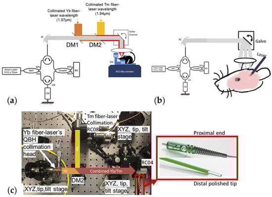 (a) Bench top fiber–laser platform consisting of the thulium (Tm) fiber laser combined with a Yb fiber–laser for cutting and coagulation, respectively, and incorporating swept source OCT image guidance. (b,c) Biocompatible silica fiber implementation of the Tm/Yb fiber laser configuration for in vivo murine brain surgery. Collimation of Yb fiber–laser beam utilized a QBH (quartz block head) collimator (IPG Photonics) from a 50 µm core silica fiber (0.1 NA) to a 3 mm diameter beam. Collimation of the Tm fiber-laser beam utilized a reflective collimator (RC08, Thorlabs Inc.). Yb and Tm beams were combined with a dichroic mirror (DM2, DMSP1500, Thorlabs Inc.) and coupled into a multimode fiber (Flexiva 200, Boston Scientific), terminating in a flat distal polished tip [65].