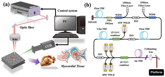 (a) Schematic diagram of the laser ablation system; (b) schematic diagram of the experimental setup of the picosecond pulsed thulium-doped fiber laser with an all-fiber structure [74].