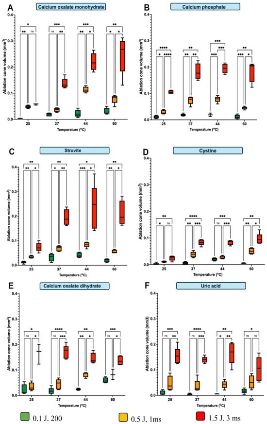 Ablation cone volume (mm3) for each individual laser pulse using different energy settings and different irrigant temperatures. p-values were calculated by post hoc analysis with a Tukey ANOVA. Symbol legend: * meaning p < 0.05; ** meaning p < 0.01; *** meaning p < 0.001, **** meaning p < 0.0001. The “ns” symbol indicates a non-significant difference [82].