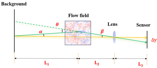 As light passes through the flow field, the variations in the medium’s refractive index gradients cause angular deflections in the trajectories of light rays originating from the background pattern. These deflected rays propagate through the imaging system and are recorded by the CCD sensor, where their positional shifts are captured as image deviations, representing the cumulative effect of refractive index gradients along the light’s path.
