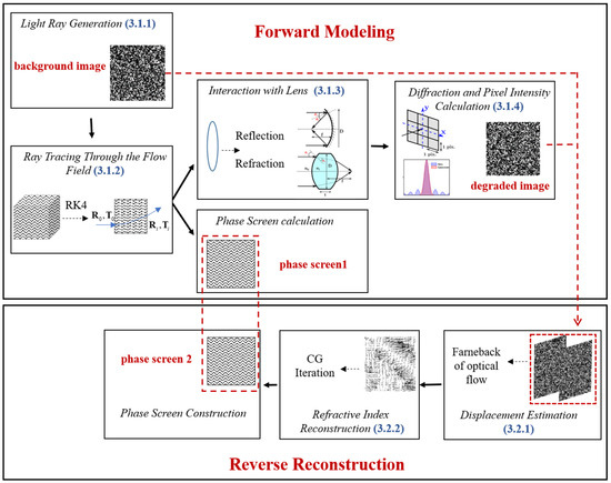 Due to the constantly changing actual flow field, it is difficult to control and obtain accurate flow field information. To achieve a controlled evaluation of the BOS-based phase screen reconstruction process, we developed a simulation-based method. The proposed methodology consists of two key components: forward modeling and reverse reconstruction, which are essentially inverse processes. As shown in Figure 2, forward modeling simulates the generation of degraded images by applying ray tracing to simulate how light rays propagate the flow field. In contrast, reverse reconstruction utilizes the difference between the original image and the degraded image to generate the phase screen and recover the flow field characteristics. These two processes are mutually dependent and enhance the robustness and applicability of the reconstruction method in real-world scenarios.