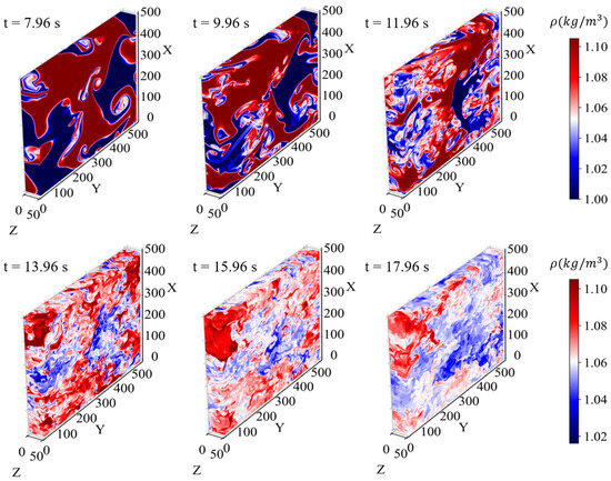 Firstly, we extract 3D density fields from the HBDT dataset at six representative time steps, t = 7.96, 9.96, 11.96, 13.96, 15.96, 17.96 s, with a fixed increment of 2 s between steps. These snapshots were carefully selected to span the most dynamic period of the HBDT simulation. They include the growth phase of turbulent kinetic energy, its peak (around t = 11.4 s), the peak of dissipation rate (around t = 11.56 s), and the subsequent decay of turbulence. As shown in Figure 4, the selected datasets represent the full volumetric density distribution with a spatial resolution of , capturing the evolving density structures during mixing. Each 3D density field is then converted to a refractive index field using the Gladstone–Dale relation, as previously described in Section 3.1.2, which serves as input for the subsequent ray tracing simulation.