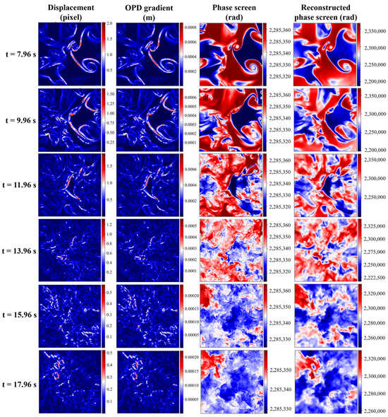 After configuring the optical system and flow field parameters, we proceed with the forward simulation using ray tracing described in Section 3.1. The light rays are traced through the flow field, and the resulting distortions, caused by refractive index variations, are captured in the degraded image. The degraded image is then compared with the background image to extract the displacement vectors, OPD gradients, and phase screen information according to inverse reconstruction in Section 3.2. Figure 5 presents the simulation and reconstruction results at six different time instances. From top to bottom, the flow field evolves chronologically (7.96 s to 17.96 s), while each column corresponds to a specific type of data: the displacement field, computed from the comparison between the original background image and the degraded image, which reveals the amount of shift in each pixel due to the refractive index variations; the OPD gradients, calculated using the inverse reconstruction method; the original phase screen calculated directly from the 3D density field; the reconstructed phase screen derived from the degraded image using the displacement and gradient data. By qualitatively comparing the two-phase screens, we clearly observe that our reconstructed phase exhibits a high degree of similarity to the original field, and the key flow features, such as vortical structures, are consistently captured by both phase screens.