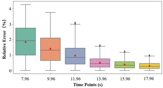 Figure 6 shows the distribution of RE across all pixels between the two-phase screens at different time points. Each box represents the interquartile range (IQR) of the error values, with the central line indicating the median, the boxes covering the middle 50% of the data, and the “whiskers” representing the range of values within 1.5 times the IQR. The red triangle in each box represents the mean error value at that time instance. In Figure 6, we first observe that RE for all time points and all pixels remains below 4%, with the majority even staying under 2%. This indicates that our simulation and reconstruction pipeline maintains a high level of accuracy and robustness across the entire turbulence evolution. More importantly, a clear decreasing trend in both mean and median RE is evident as time progresses. This can be attributed to the physical decay of the turbulent flow. In the early stages (e.g., time steps 7.96 s–11.96 s), the turbulence is strong, and the density field exhibits sharp gradients and complex spatial structures. These features induce stronger optical distortions and larger refractive index fluctuations, which challenge the BOS-based reconstruction and contribute to relatively higher errors and broader distributions. As the simulation progresses (e.g., time steps 13.96 s–17.96 s), the buoyancy-driven turbulence begins to decay, leading to smoother density fields and weaker refractive index gradients. This results in less severe optical distortions, allowing the BOS algorithm to perform more reliably with reduced reconstruction error. Accordingly, the error distributions become narrower, with shorter whiskers and reduced IQRs, indicating improved stability and precision of the reconstruction in weaker turbulence conditions.