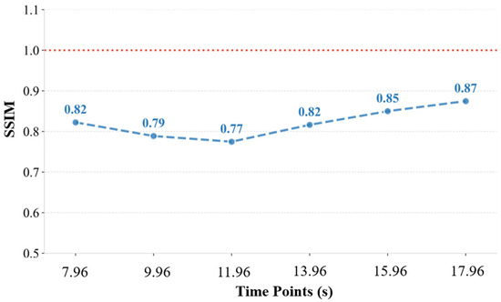At the same time, in Figure 7, the SSIM values remain above 0.75 across all time points, indicating that our reconstructed flow field preserves the overall structural integrity and spatial patterns of the original field with high fidelity. Interestingly, the SSIM curve exhibits a non-monotonic trend: it decreases initially, reaching a minimum of around 11.96 s, and then gradually increases toward 17.96 s. This variation can be understood by examining the physical evolution of the flow field during the decay of buoyancy-driven turbulence. At the beginning of the selected window (e.g., t = 7.96 s to 11.96 s), although the turbulence is already past its initial development stage, residual large-scale structures and coherent density gradients are still present. These provide strong BOS signals that facilitate accurate reconstruction, contributing to higher SSIM values. In the mid-stage of decay (e.g., t = 11.96 s to 13.96 s), the turbulence enters a more complex transitional regime, where large vortices break down, and small-scale mixing dominates. This stage features increasingly fragmented and fine-grained density structures, which are harder to resolve and reconstruct accurately, leading to a slight drop in SSIM values. As the decay continues further (e.g., t = 15.96 s to 17.96 s), the turbulence weakens significantly, and the flow becomes smoother and more uniform, with lower density gradients. The reduced structural complexity and optical distortion allow the BOS algorithm to recover the flow features more consistently, causing SSIM to rise again. Notably, even during the more challenging mid-decay stage, the SSIM remains above 0.77. This demonstrates the robustness of our reconstruction method in handling varying levels of structural complexity and its effectiveness across different turbulence decay stages.
