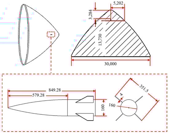 The aircraft model and corresponding flow field setup (Unit: mm).
