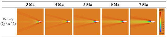 The resulting density distributions around the aircraft at Mach 3, 4, 5, 6, and 7 clearly exhibit well-defined oblique shock structures, as depicted in Figure 9. As expected, the shockwave forms ahead of the aircraft and extends obliquely downstream. With increasing Mach number, the shock angle becomes steeper, and the shockwave compresses further toward the aircraft’s body. Additionally, the post-shock expansion region grows more pronounced at higher speeds, with density gradually decreasing and the wake becoming more diffuse. These results validate the correctness of the simulated flow fields and provide a solid foundation for analyzing the optical distortions they produce.