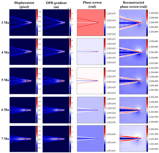 With the generated shockwave fields at different Mach numbers, we proceed with our forward and inverse simulations. The result is shown in Figure 10; each row corresponds to a different Mach number, and from left to right, the columns show the displacement field, the OPD gradient, the original phase screen, and the reconstructed phase screen. Through qualitative observation, we found that the phase screen reconstruction performs well across the evaluated Mach numbers. As the Mach number increases from 3 to 7, the shock structures become progressively sharper and more compressed, and this trend is clearly reflected in both the displacement field and OPD gradient field. Despite the presence of sharp refractive index discontinuities introduced by the shock waves, the reconstructed phase screens generally preserve the global shape and spatial distribution of the phase features. Particularly, the overall geometric shapes of oblique shock waves, such as angular direction, position, and range, are consistently captured.