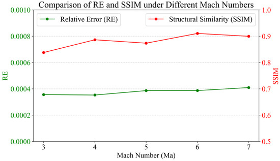 To further evaluate the reconstruction performance, we compute RE and SSIM between the original and reconstructed phase screens across different Mach numbers. As shown in Figure 11, the RE values, indicated by the green curve, remain consistently low across all Mach numbers. A slight increase in RE is observed with higher Mach numbers, indicating that the absolute differences between the reconstructed and original phase screens become larger in sharper, more compressed shockwave fields. This is expected as higher Mach numbers introduce stronger refractive index discontinuities and greater optical complexity. Meanwhile, the SSIM values, represented by the red curve, consistently exceed 0.8, suggesting that the reconstructed phase screens retain strong global structural similarity to the original ones. However, a closer inspection reveals that SSIM does not monotonically increase or decrease with Mach number but, instead, exhibits a nonlinear, M-shaped fluctuation. This trend likely reflects a balance between two competing effects: on the one hand, increasing Mach numbers lead to more distinct and well-defined shock structures, which enhances structural alignment and boosts SSIM; on the other hand, these same high-gradient regions, particularly near the shock tip, are more prone to localized reconstruction errors, which suppress SSIM.