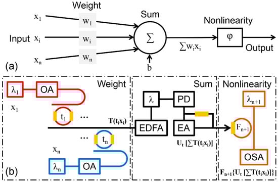 Biological neurons comprise three primary components: the synapses, soma, and axon []. The signal processing of the biological neuron is shown in Figure 1a. Synapses determine the connection strength between neurons where the input signals are weighted. These weighted signals are summed in the soma. Subsequently, the axon applies a nonlinear transformation to the sum. The entire signal processing can be expressed as follows: