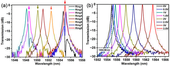 (a) Transmission spectrums of eight cascaded MRRs. (b) Tuning performance of ring 8, with tuning voltage ranging from 0 to 3.5 V in 0.5 V increments.