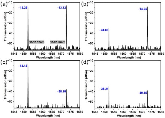 For matrix multiplication, the system was designed to perform parallel multiplication of input signals with their corresponding weights without crosstalk. Rings 6 and 8 were selected to apply weights, with their resonance wavelength set at 1552.52 and 1572.96 nm, respectively. Notably, ring 8 was configured in the L-band to avoid confusion. The input signal matrix was set to (1, 1) using two lasers with the same resonance wavelengths matched to the respective MRRs. The computational results are presented in Figure 4. Figure 4a shows the matrix multiplication of the input signal matrix (1, 1) and weight vector (1, 1), which were obtained to make two MRRs on-resonance. Figure 4b shows the matrix multiplication of the input signal matrix (1, 1) and weight vector (0, 1) by applying a voltage of 1 V to make ring 6 off-resonance. The first signal was weighted, and its transmission decreased by 20 dB compared to that of the second signal. Figure 4c shows the matrix multiplication of the input signal matrix (1, 1) and weight vector (1, 0) by making ring 8 off-resonance with a voltage of 1.6 V, yielding a 25 dB suppression of the second signal. Figure 4d shows the matrix multiplication of the input signal matrix (1, 1) and weight vector (0, 0) by applying the voltage of 1.2 V and 1.3 V to rings 6 and 8, respectively, with a total power consumption of approximately 12.78 mW, with almost no thermal crosstalk. These results conclusively demonstrate independent weight configurability through individual thermal tuning of each MRR.