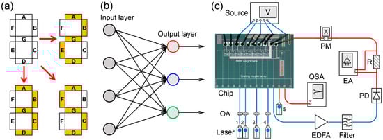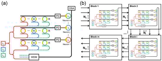 For the recognition task, the neural network consisted of only two layers, including four inputs and three outputs. However, practical applications require more sophisticated multilayer architectures. Figure 8a shows the fundamental neural network unit, which consisted of n inputs and m outputs. All the inputs and outputs and the weight part were in WDM architecture. The weight and nonlinear operations were achieved using thermally tunable MRRs. On the basis of a single neural network, a complex multilayer neural network was established and is presented in Figure 8b, featuring N1 inputs and Nm outputs. Each block included a fundamental neural network representing an individual layer of the multilayer neural network. The numbers of layers and neurons allowed for flexible expansion based on the requirement of different applications. Future research will focus on expanding the network complexity by developing deep photonic neural networks through cascaded MRR-based photonic neurons []. An autapse will also be established using the same MRR platform. Additionally, PD and EA in the summation unit will be integrated on a chip to achieve better compactness and miniaturization.