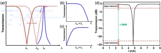 To achieve the nonlinear function, thermally tunable MRRs were selected for their inherent nonlinear transmission. The schematic of the nonlinear operation is shown in Figure 6a–c. The blue spectrum denotes the laser wavelength , while the red solid and dotted peaks represent the initial and thermally tuned resonance wavelengths of MRR, and , respectively. As the MRR was thermally tuned, was right-shifted to modulate the amplitude of in the resonance envelope. This mechanism produced two distinct nonlinear response regimes: When , the shape of the nonlinear function was the inverse-rectified linear unit (inverse-ReLU), while the shape of the nonlinear function was ReLU when , as shown in Figure 6b,c, respectively. Figure 6d shows the nonlinear function of the proposed photonic neuron depicting the relationship between the MRR transmission and excitation current. The resonance wavelength of MRR was 1554.74 nm, while the wavelength of the laser was set to 1555.52 nm. Therefore, the shape of the nonlinear function included two stages, as illustrated in Figure 6b,c. The critical current was about 4.75 mA and the extinction ratio was 25.21 dB. To eliminate the noise caused by spectral jitter, the transmission difference between the high and low values (the upper and lower tolerance) was maintained above 20 dB.