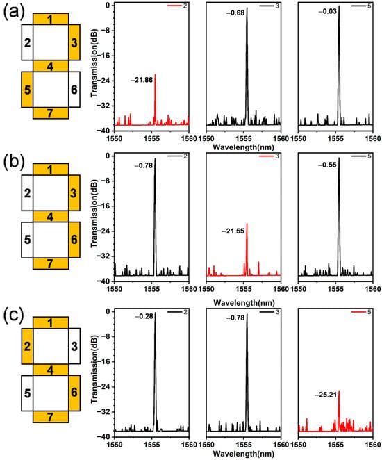 The recognition task was implemented through weighting and nonlinear operations using thermally tunable MRRs. Four lasers were switched between the off and on-states to represent the input signals of numbers 2, 3, and 5. For digit 2, lasers 2 and 3 were in the on-state, while lasers 1 and 4 were in the off-state. For digit 3, lasers 3 and 4 were in the on-state, whereas lasers 1 and 4 were in the on-state for digit 5. To implement the recognition of digit 2, rings 4 and 6 were tuned to be on-resonance, while rings 3 and 8 were tuned to be off-resonance. The result for the recognition of digit 2 is shown in Figure 7a, demonstrating significant transmission contrast between the recognized digits. Specifically, the transmission for digit 2 exhibited an approximately 21 dB attenuation compared to those for digits 3 and 5. The excitation current and power consumption for digit 2 were 4.73 mA and 5.59 mW, while the tunning power was about 8.87 mW. The recognition results of digits 3 and 5 are shown in Figure 7b,c. Digit 3 exhibited an approximately 21 dB lower transmission compared to digits 2 and 5, and digit 5 demonstrated about 25 dB attenuation relative to digits 2 and 3. The excitation current and power consumption for digit 3 were 4.73 mA and 5.59 mW, whereas those for digit 5 were 4.76 mA and 5.65 mW. The tunning powers were about 8.65 mW and 9.38 mW, respectively. As the MRRs depended on the thermal tuning effect, the processing speed of our photonic neural network was relatively limited. Conclusively, digits 2, 3, and 5 were successfully recognized using the photonic neural network based on thermally tunable MRRs. The performance comparison for our work with previous experimental works is shown in Table 2. Although the structure of our proposed neural network was relatively simple and complex recognition tasks with online training were not implemented, ONNs using MRRs for both weighting and nonlinear operations were verified at the system level.