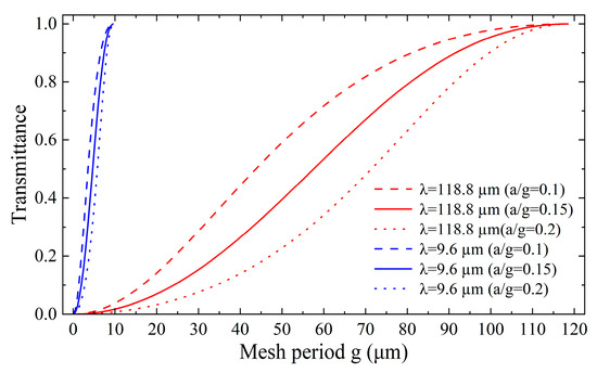 The transmittance as a function of the mesh period for the metal mesh under different a/g parameters.