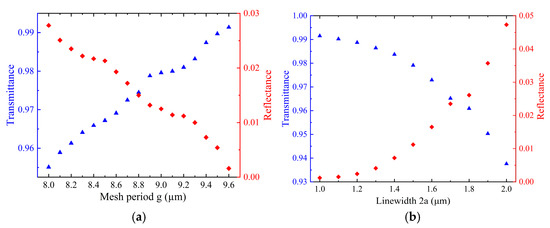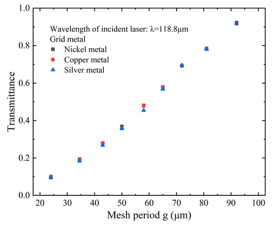 Considering the dielectric refractive index between the two sides of metal mesh is n1 and n2, respectively, and n2 ≥ n1. According to the microwave transmission line theory, to ensure that transmission light has only zero-order diffraction, the metal mesh period g must satisfy the following conditions: g < λ/n1 and g < λ/n2, where λ represents the wavelength of incident light. Neglecting the thickness of the metal mesh, the transmittance of metal mesh to incident light is given by the following [23]: